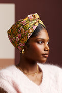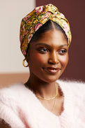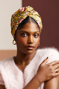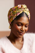 Turban facile à nouer imprimé floral rétro jaune moutarde multicolore
