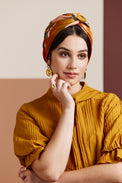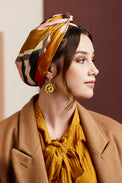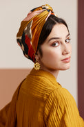 Turban facile à nouer motif abstrait noir marron jaune et orange