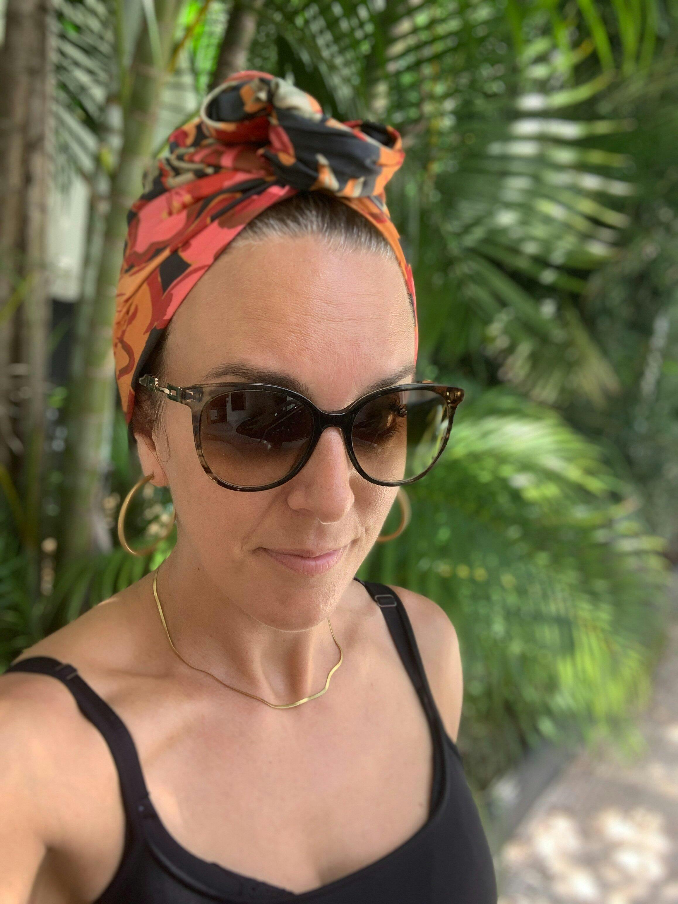 Ce turban bohème chic aux motifs floraux capture l'élégance parisienne et la rend accessible aux femmes qui cherchent un foulard pour cheveux facile à nouer.