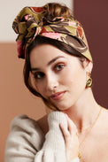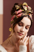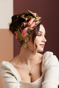 BANDEAU CHEVEUX À TIGES METALLIQUES imprimé floral vert kaki et rose