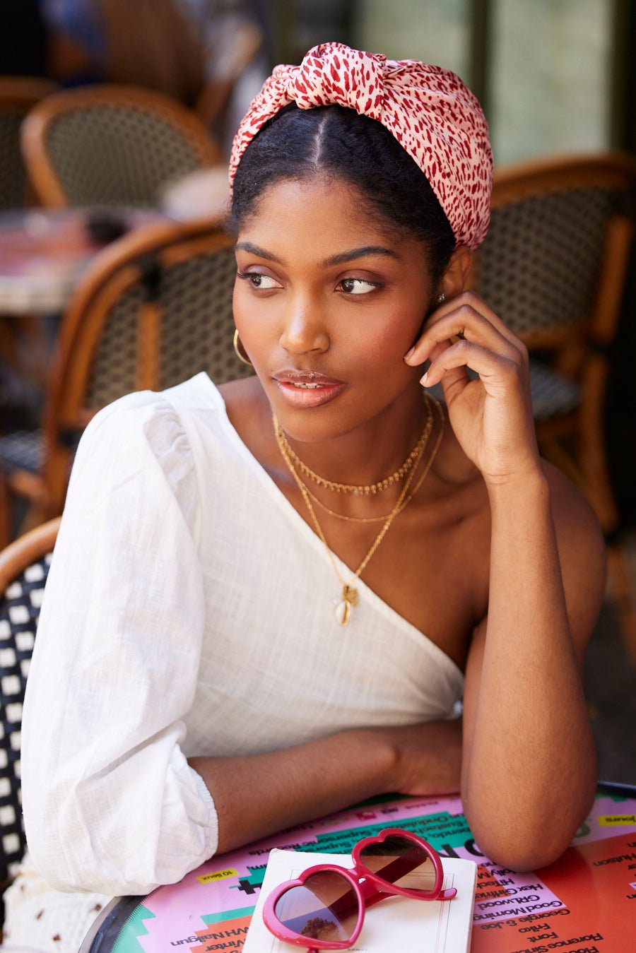 Avec un imprimé léopard rose et rouge, à la fois délicat et moderne, ce turban incarne un style tendance et citadin, Parfait avec une blouse blanche ou un trench beige.