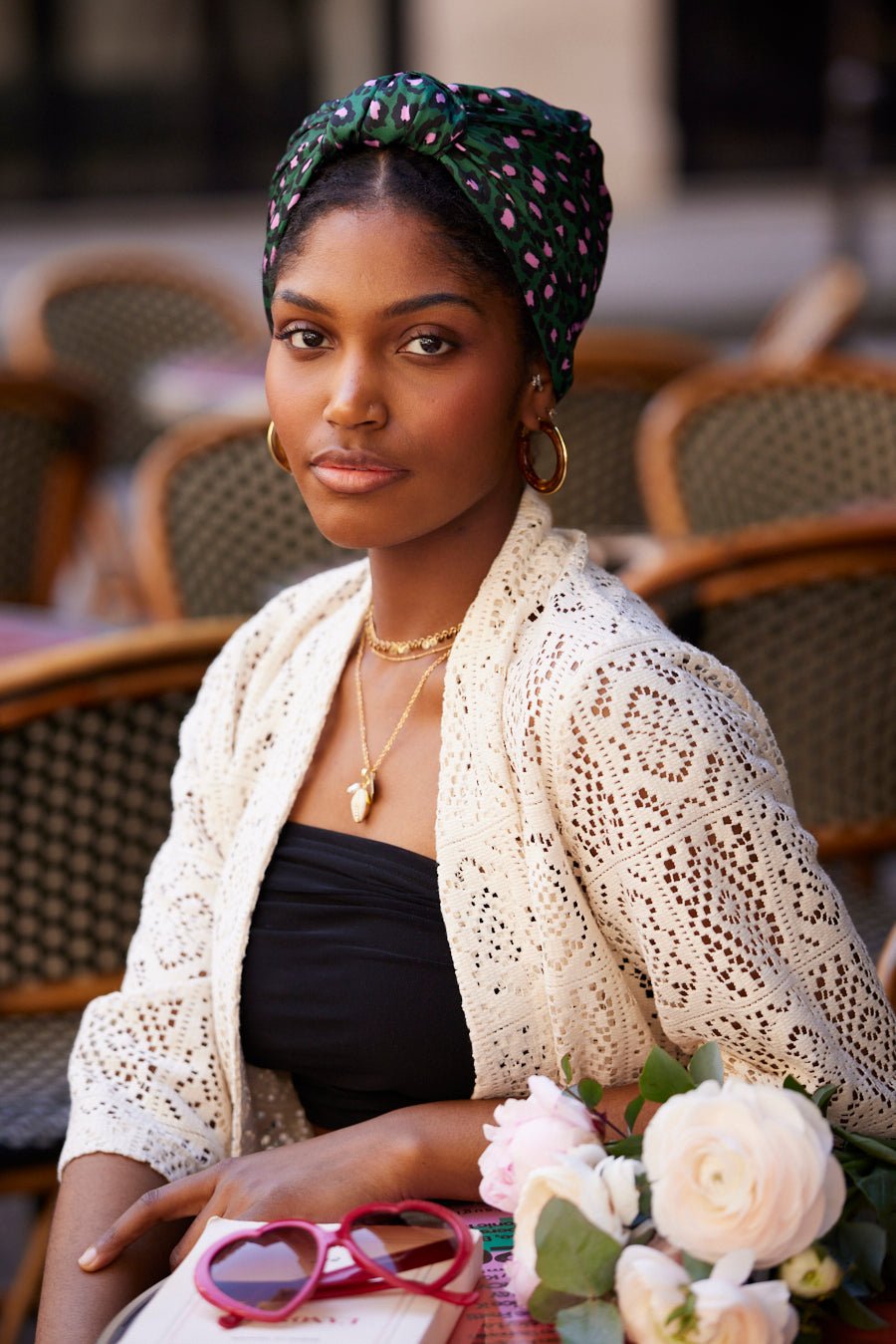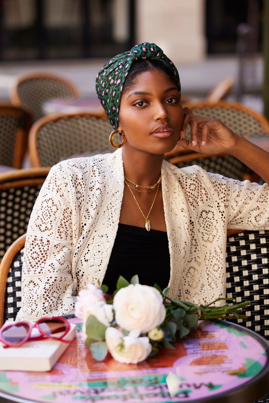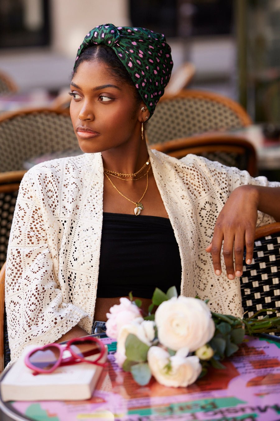 Avec ses couleurs  audacieuses vert profond et rose poudré, ce turban revisite le motif léopard avec un twist moderne et fun ! Son nouage classique au style rétro en fait une pièce incontournable à avoir dans sa garde robe.